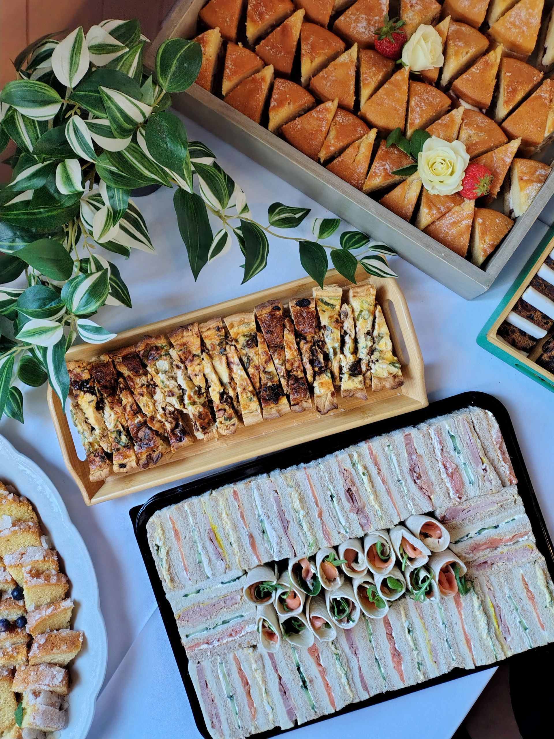 Our Classic style funeral tea package includes, sandwiches and wraps, homemade sausage rolls , quiche, a selection of cakes , mini scones, Unlimited hot drinks - China plates , teacups & saucers, napkins, hot water urn , staffing.